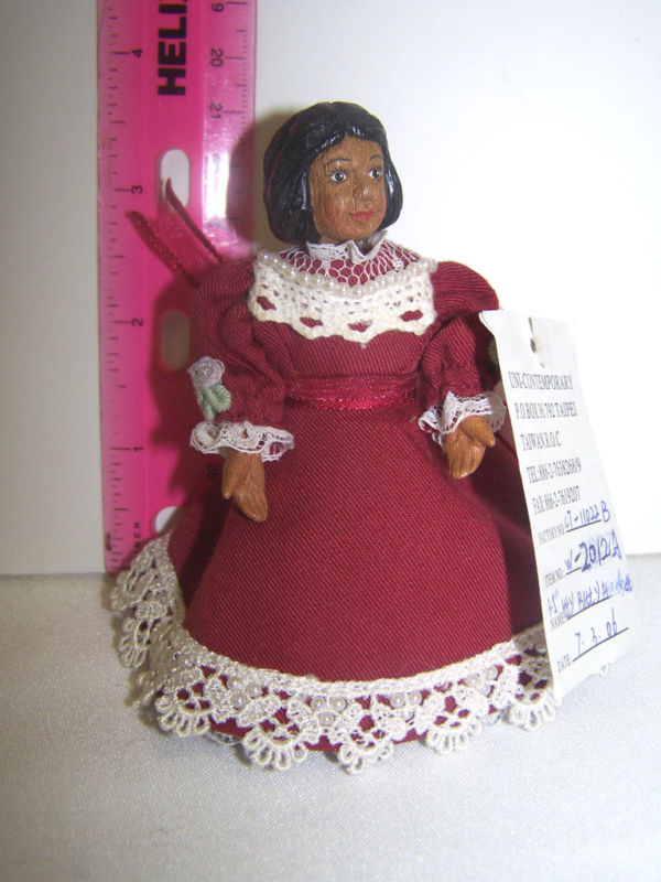 I just bought this doll for myself for Christmas. She's a Robert Raikes miniature African American Hitty doll, 3.5" tall, a "factory sample," which is a completed doll sent to the Raikes company for approval before they produce a lot. Unfortunately, the Robert Raikes Co. isn't operating right now. Hopefully, when times improve, they will open again, as I love his dolls. I have a full-size Hitty (6.25" tall) and another of his wooden dolls that is about 12" tall. His company made really nice wooden dolls.